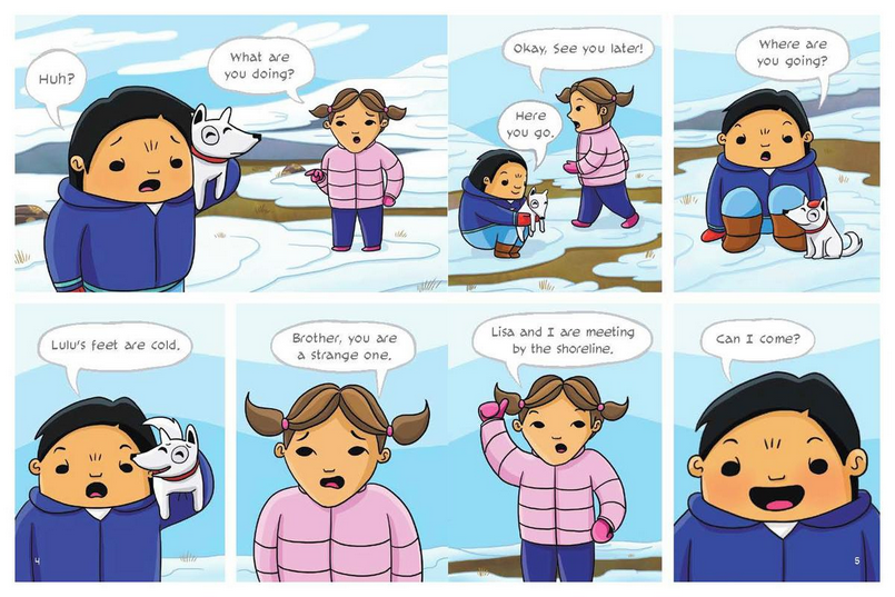 On their way to the shoreline, Putuguq and Kublu run into their grandfather, who has a stern warning for the pair: Always beware when playing on the shore, because you never know if a qalupalik, a mythical creature that snatches children, is lying in wait under the ice. Kublu is pretty sure their grandfather is just trying to spook them with a scary story from the past . . . but maybe not?