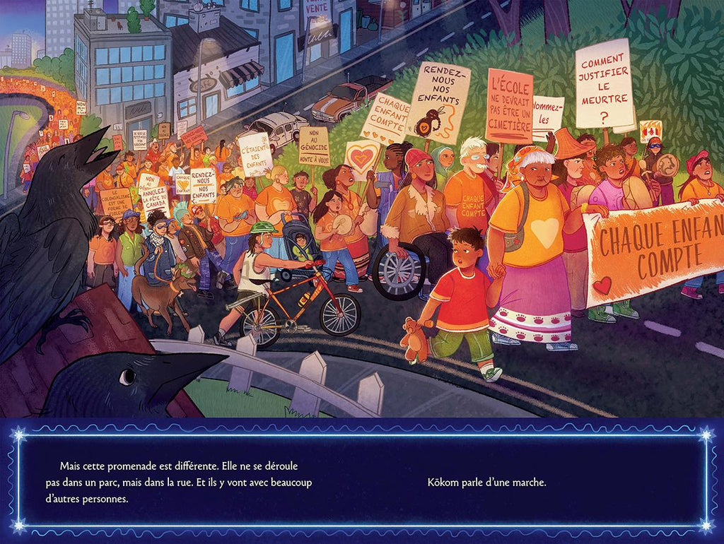 Un jour, la kōkom de James l’emmène faire une promenade spéciale avec un grand groupe de personnes. Cela s’appelle une marche, et celle-ci se termine devant un grand tas d’objets : des ours en peluche, des fleurs, du tabac tressé et des petits souliers. Kōkom explique à James qu’il s’agit d’un monument commémoratif en l’honneur des enfants autochtones qui sont allés dans des pensionnats, mais qui n’en sont jamais revenus. Il apprend que sa kōkom a été emmenée dans l’une de ces écoles avec sa soeur, qui n’est pas non plus rentrée chez elle.