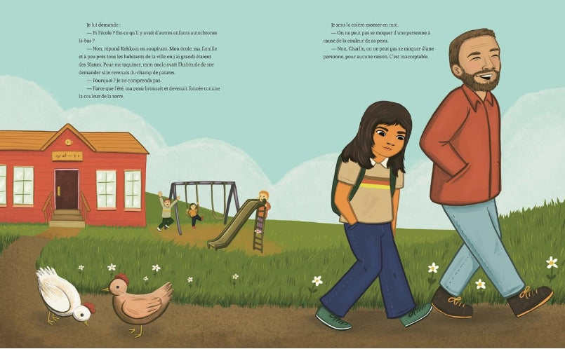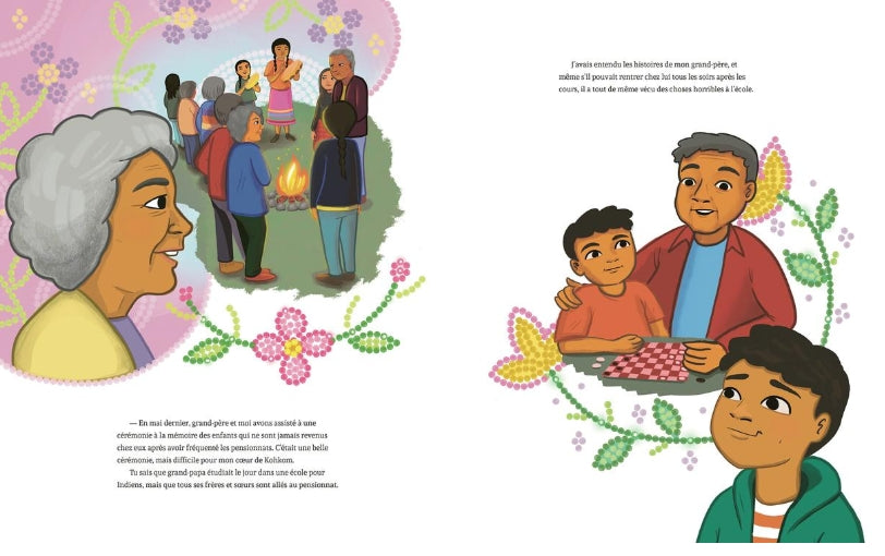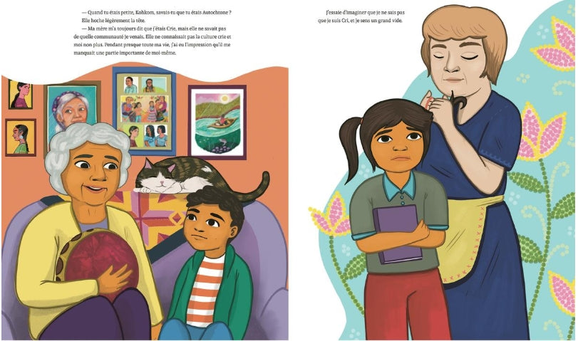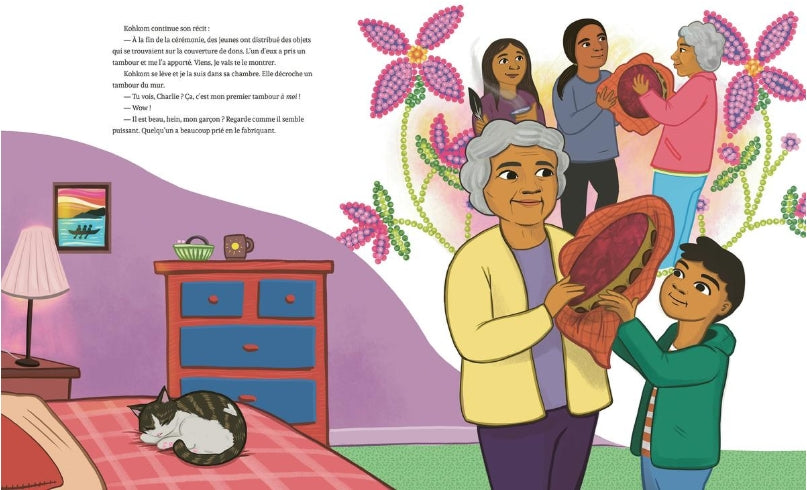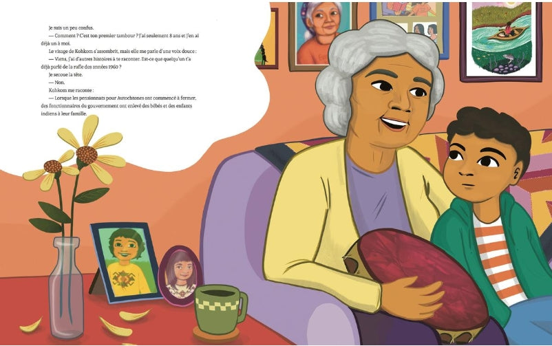 Kohkom explique qu’elle a été enlevée à sa famille quand elle était toute petite, lors de ce qu’on appelle la « Rafle des Années 1960 ». Elle a été adoptée par une famille blanche et c’est plus tard seulement qu’elle a découvert la culture Crie. Il lui a fallu beaucoup de temps pour commencer à se sentir à sa place. C’est une histoire triste, mais elle donne une idée à Charlie : il va enseigner une chanson à Kohkom et ils vont la jouer ensemble sur leurs tambours.