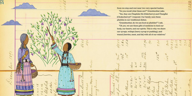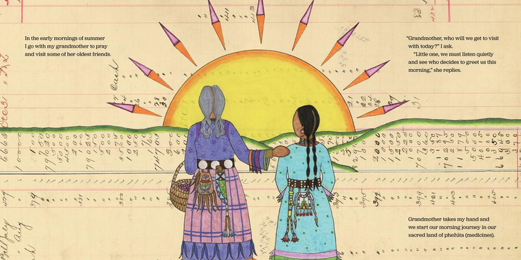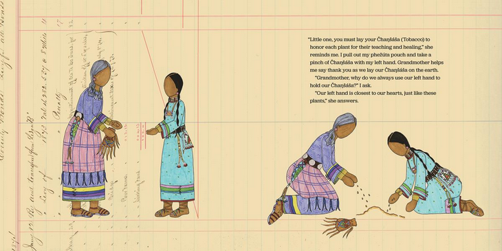 Grandmother and Granddaughter sing a special song to the plants. They say hello to Chaŋíčaȟpehu (Stinging Nettle), to Čhaŋȟdóȟu (Broadleaf Plantain), to Čhaŋpȟá (Chokecherry). Some of these plants are full of vitamins. Some help soothe stings and pains. Some make tasty and healing syrups. Together, Grandmother and Granddaughter offer Čhaŋšáša (Tobacco) to honor each plant in their path.