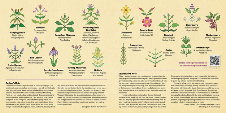 Tanaǧidaŋ To Wiŋ Tara Perron is a Dakota and Ojibwe mother, writer and educator. She enjoys sharing her Indigenous culture, language, art, and healing traditions through classes, tours, and her Blue Hummingbird Woman Indigenous Gift Shop in St. Paul, Minnesota. Illustrated by Holly Young (Thizáptaŋna/Wičhíyena Dakota, Standing Rock Reservation) who was raised by her grandmother in a rural area of the Standing Rock Reservation in North Dakota. She is committed to preserving and sharing traditional Dakota floral styles and designs through her beadwork, quillwork, and ledger art, which are seeds from which her vision grows. Through art, she affirms herself as a Dakota woman and mother by practicing Winyan Omniciye, the circle of sharing knowledge: What you learn, you give back.