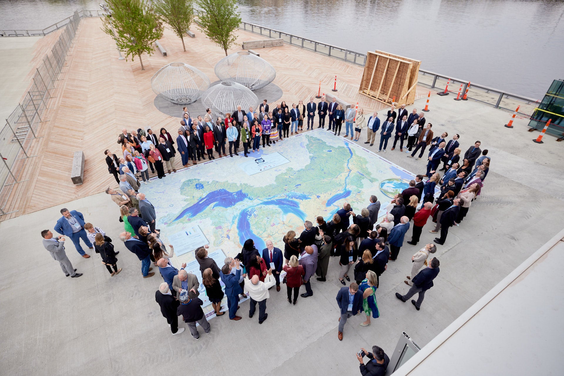 The Biinaagami Giant Floor Map is a unique and engaging tool encouraging people of all ages to explore the Great Lakes-St. Lawrence watershed. Traverse the rivers and tributaries of the Great Lakes basin from source waters, through streams and lakes, and eventually to the Atlantic Ocean. Explore Indigenous languages spoken in your region, find out whose land you’re living and learning on while moving through the Great Lakes with two-eyed seeing.